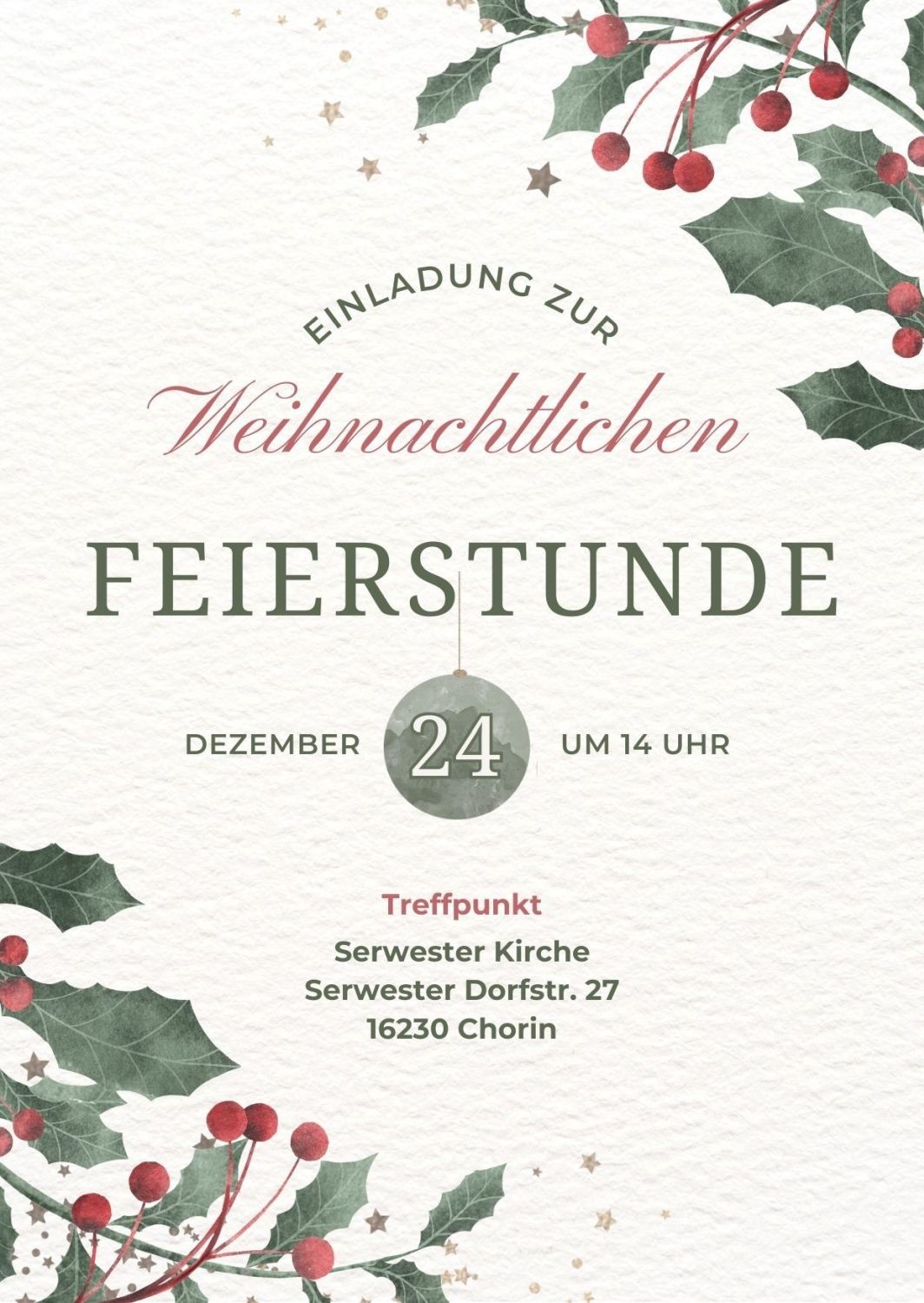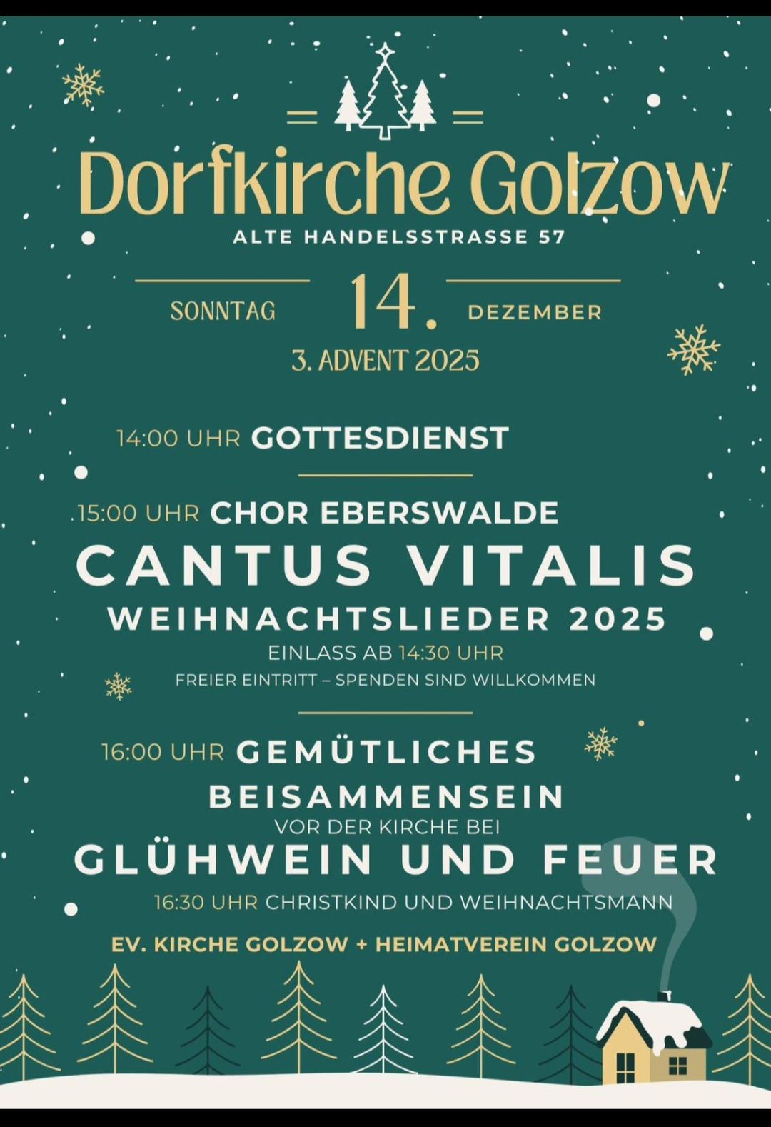 14:00 Uhr Gottesdienst, 15:00 Chor aus Eberswalde, 16:00 Uhr Gemütliches Beisammensein vor der Kirche bei Glühwein und Feuer, 16:30 Uhr Christkind und Weihnachtsmann – Eintritt frei, Spenden erwünscht