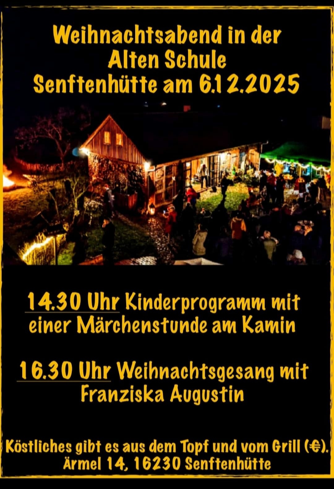 14:30 Uhr Kinderprogramm mit einer Märchenstunde am Kamin, 16:30 Uhr Weihnachtsgesang mit Franziska Augustin
